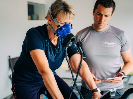 PERFORMANCE-ANALYSE(Analyse des Stoffwechsels unter Belastung)Testdauer: ca. 15 Minuten auf dem Ergometer.Während der Belastung wird alle 3 Minuten der Widerstand bis zur persönlichen Belastungsgrenze gesteigert. Dabei werden Ihre Puls- und Atemgaswerte gemessen.
